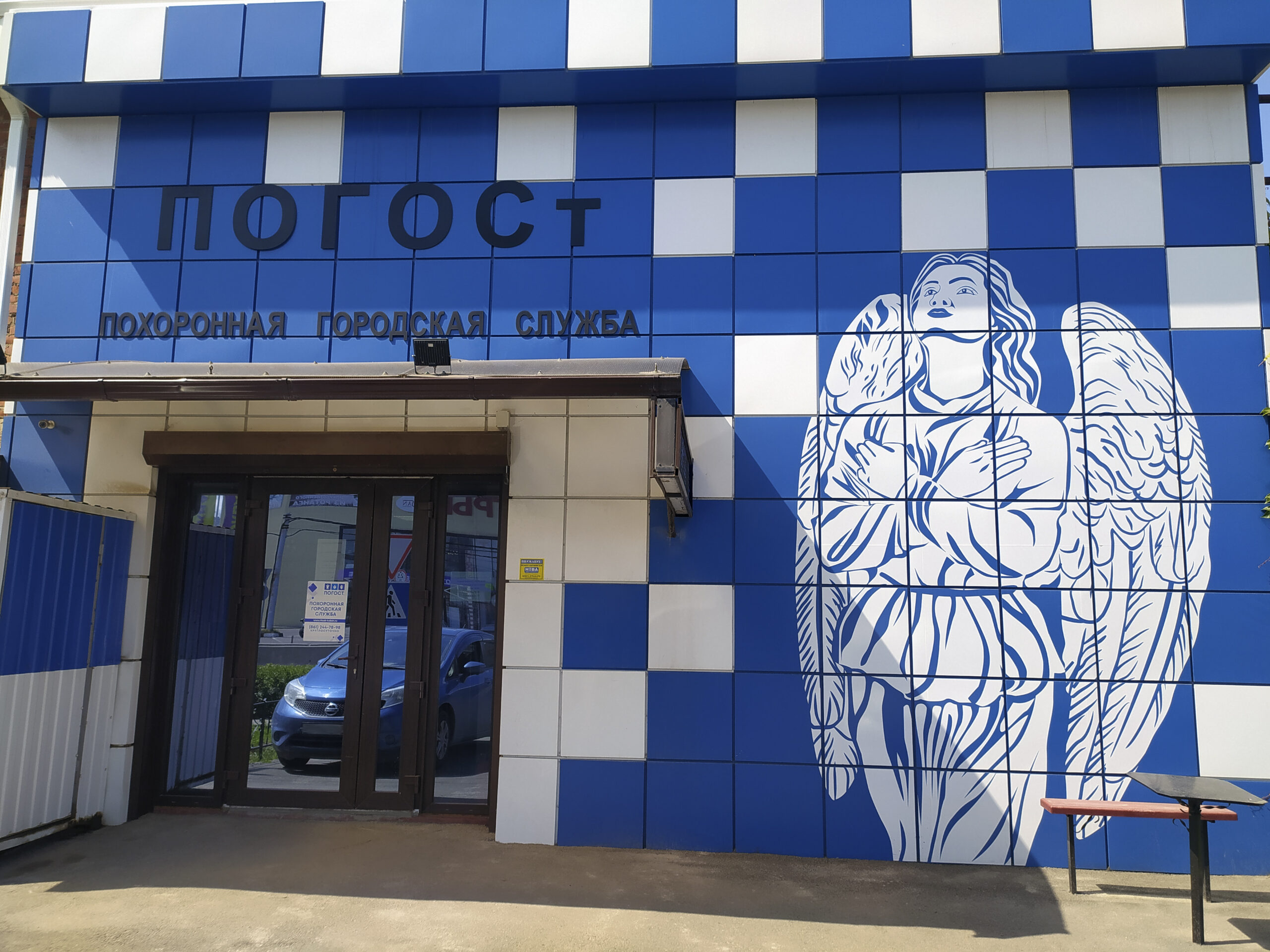 На въезде на территорию кладбища располагаются магазины ритуальных товаров, мастерские по изготовлению памятников, офисы похоронных бюро.